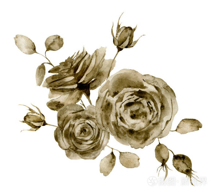水色单色玫瑰花束 手绘的八百花花和浆果与桉树叶和分支查出在白色背景为设计 打印或织品照片 正版商用图片18s7sr 摄图新视界